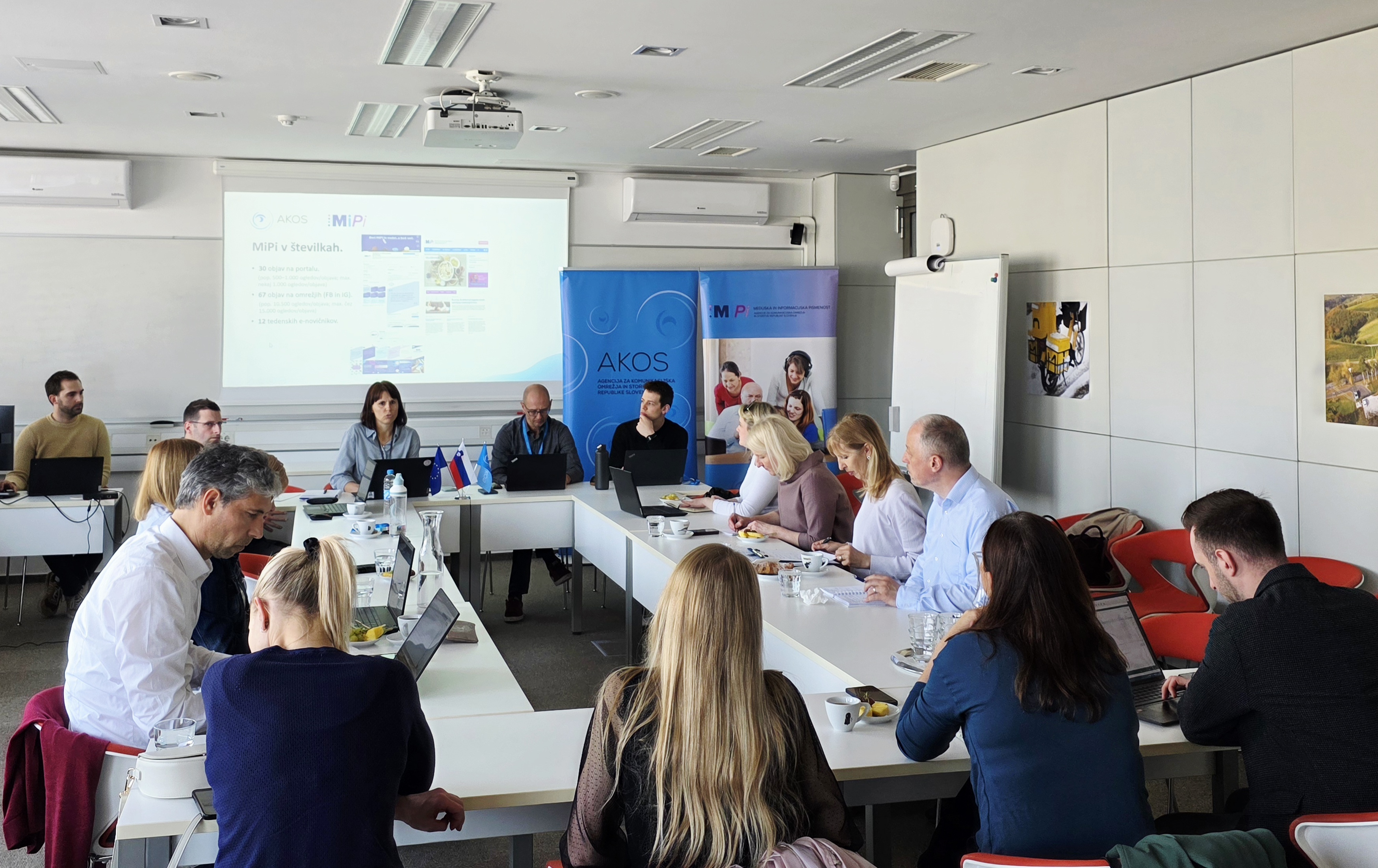 Agencija za komunikacijska omrežja in storitve (AKOS) je 16. aprila 2026 gostila redno srečanje partnerjev portala MiPi, na katerem so udeleženci obravnavali ključne izzive sodobnega digitalnega okolja ter pregledali aktualne projekte.